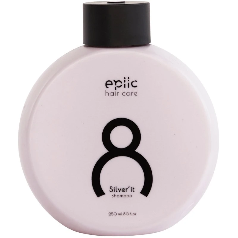 epiic hair care No. 8 Silver’it Shampoo er en fantastisk silvershampoo, som egner sig specielt godt til blondt og gråt hår. Den er beriget med violette pigmenter, som er med til at neutralisere uønskede gullige nuancer og giver dermed håret en koldere tone.