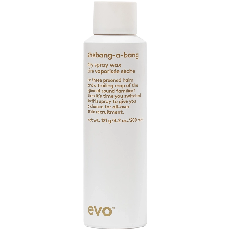 Evo Shebang-A-Bang Dry Wax er en spray-voks med ultra fin forstøvning, designet til at give let, modellerbar struktur og en satin finish. Den anbefales til alle hårtyper og længder, der har brug for fleksibel, modellerbar struktur. Den fint forstøvende spray sikrer en let og jævn fordeling.