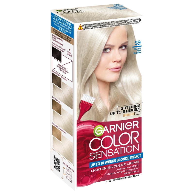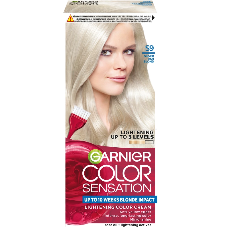 Garnier Color Sensation Lightening Permanent Color Cream – S9 Silver Ash Blond er en ekstra lysnende permanent hårfarve, som lysner op til 3 toner og giver op til 10 ugers smukt blond hår.