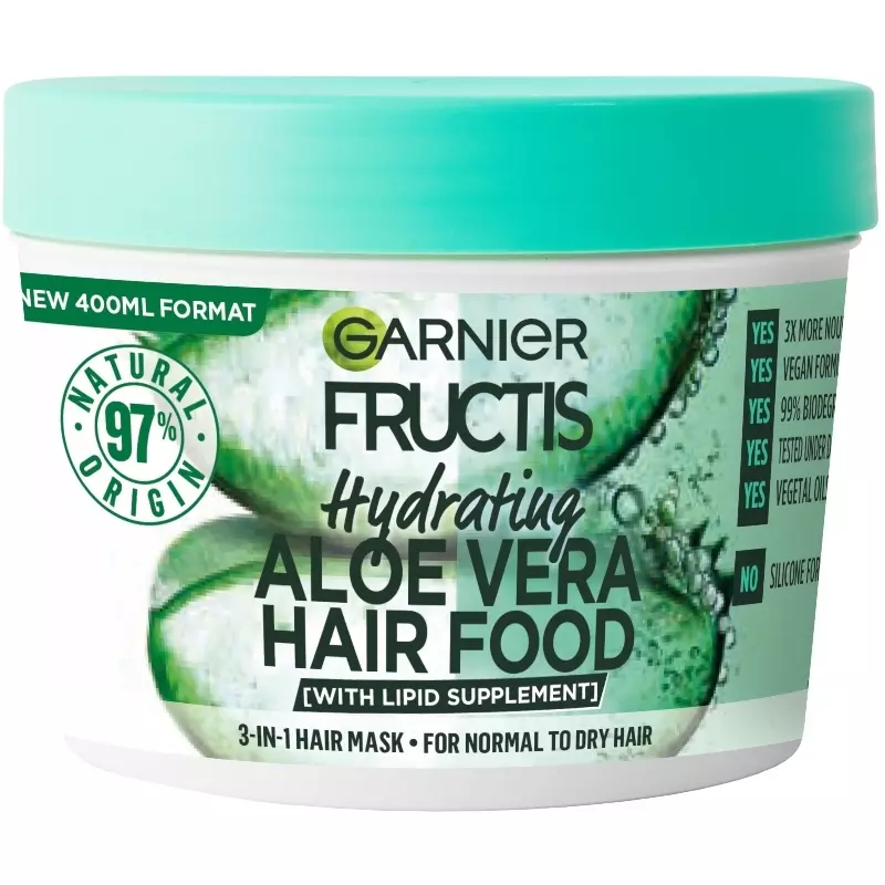 Garnier Fructis Hair Food Aloe Vera Mask er en fantastisk og super velduftende 3-i-1 hårmaske til dig med et normalt eller tørt hår. Den består af 98% naturlige ingredienser såsom planteolie, og egner sig godt til curly girl metoden.