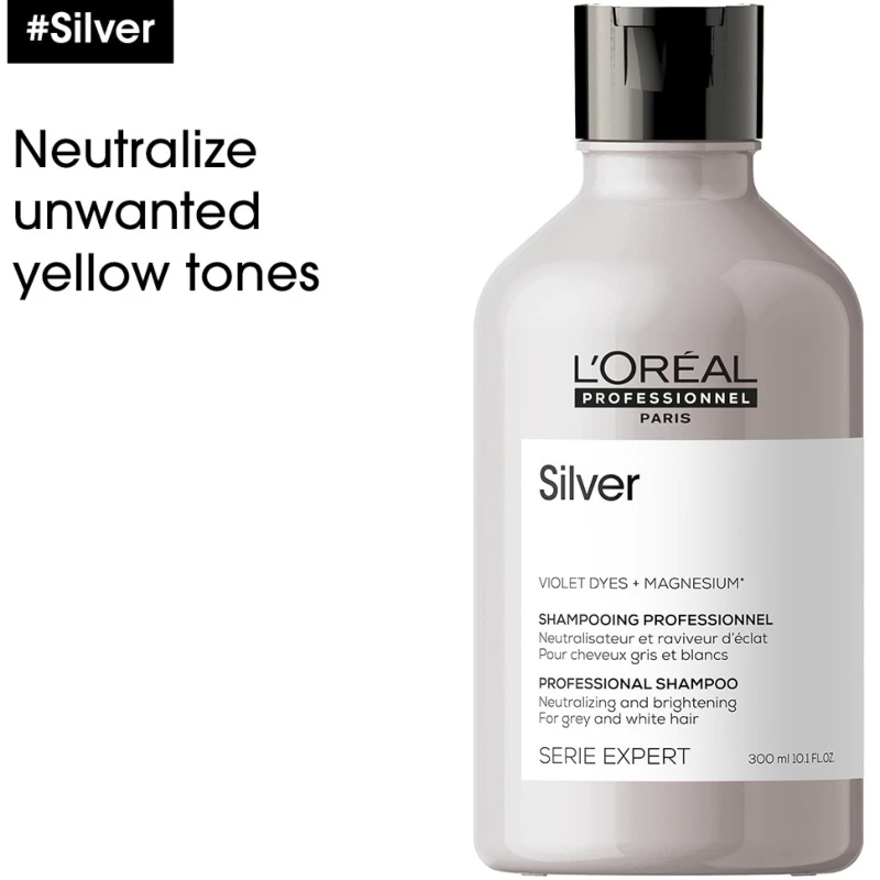 L’Oréal Pro Serie Expert Silver Shampoo indeholder aminosyrer og andre plejende ingredienser, der effektivt fjerner misfarvninger, samtidig med at den nærer håret i dybden.
