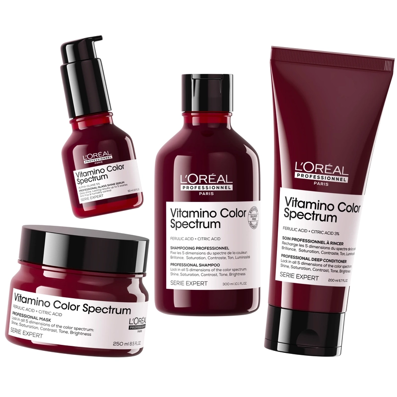 L’Oréal Professionnel Vitamino Color Spectrum Glass Shine Serum er et serum til farvebehandlet og afbleget hår. Bevar en glasagtig glans* med resultater, der varer i op til 10 hårvaske**.