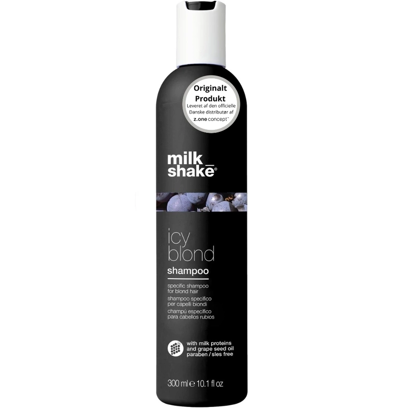 Milk_shake Icy Blond Shampoo er en shampoo til dig med et meget lyst eller platinblond hår, som ønsker at det får en helt kold farve. Denne shampoo er nemlig beriget med sorte pigmenter, der neutraliserer uønskede gyldne toner og efterlader håret med en sart ask farve. Hvis man ved frisøren får farvet sit hår grå/sølvfarvet, så er denne shampoo også perfekt til at holde farven vedlige derhjemme med.