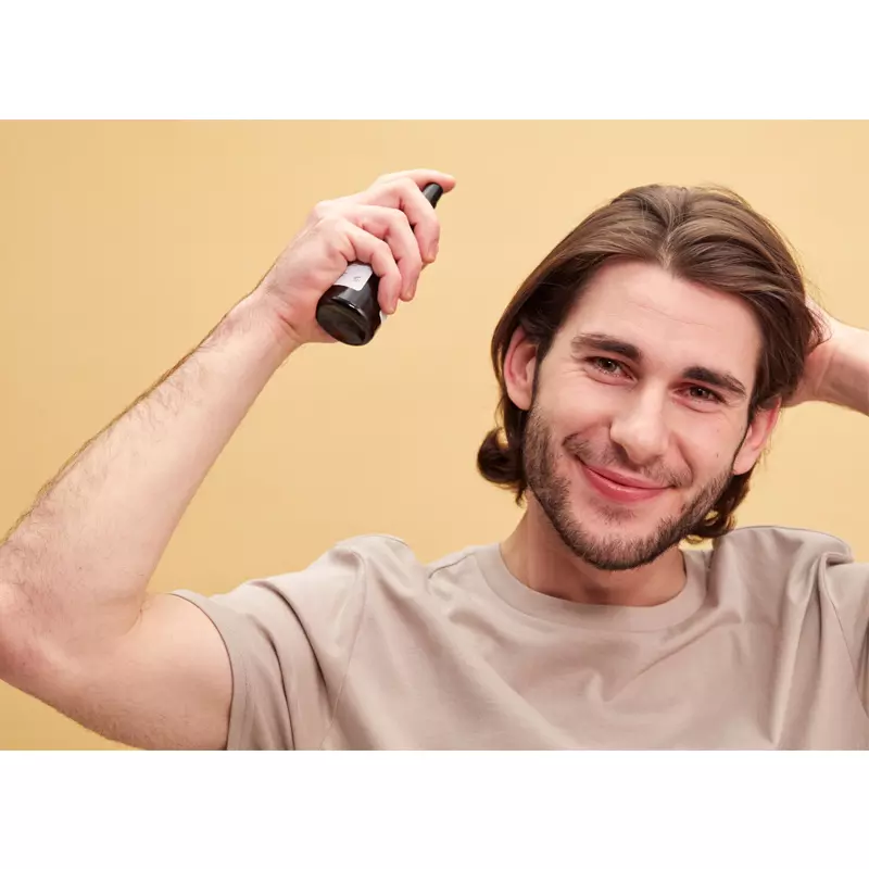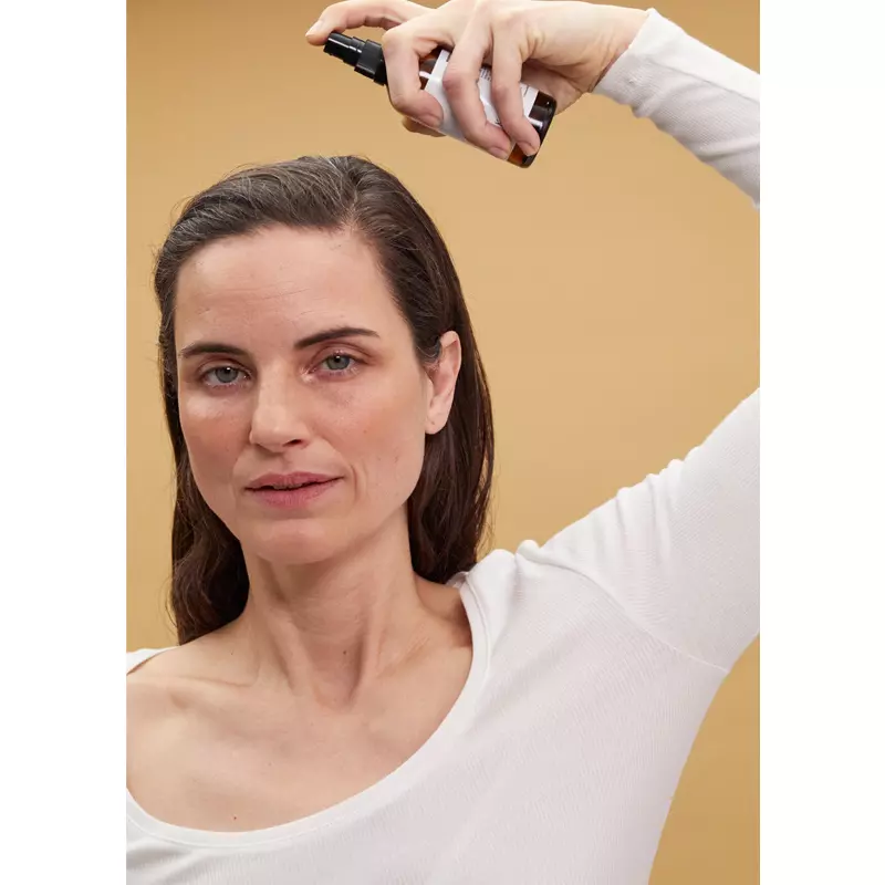 - Spray 5-10 pump serum direkte i hovedbunden, fokusér på de områder, hvor der ønskes effekt