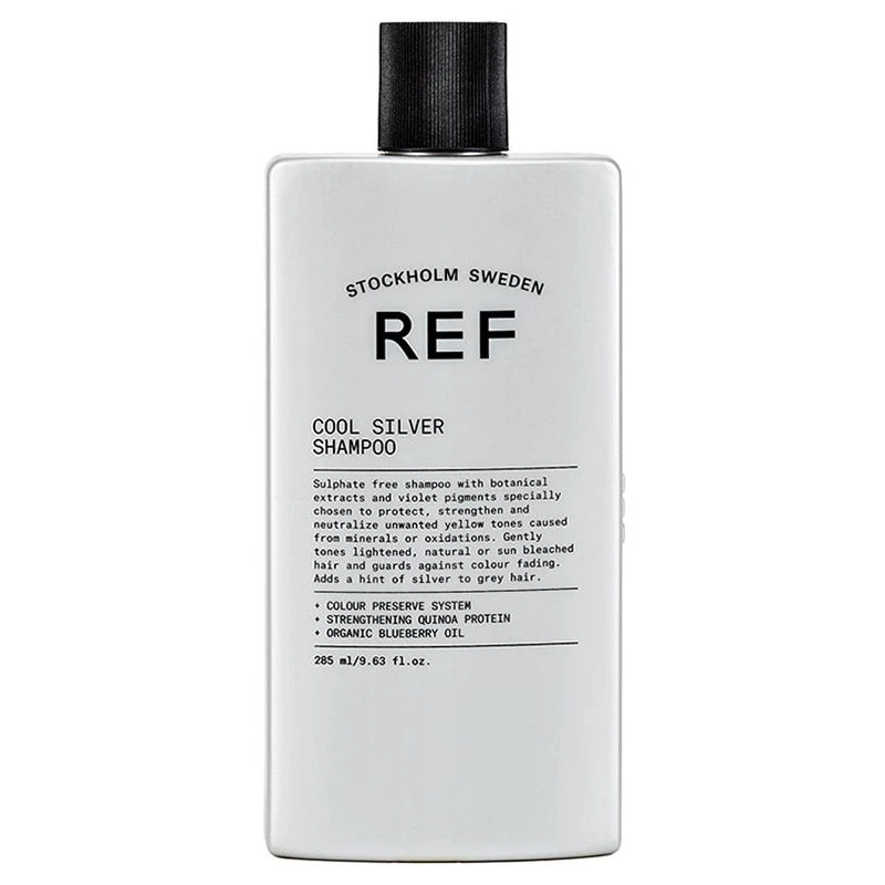 REF Cool Silver Shampoo er en sulfat fri shampoo der styrker og beskytter håret. Shampooen indeholder botaniske ekstrakter og violette pigmenter der er specielt udviklet til at at neutralisere et uønsket gult skær, når man har afbleget hår, eller solblegede striber. REF Cool Silver Shampoo er ideel til at give et gråt/hvidt hår et flot sølvskær samt beskytter håret mod farvetab. En lækker vegan venlig silverhampoo berriget med styrkende quinoa proteiner og organisk blåbær olie.