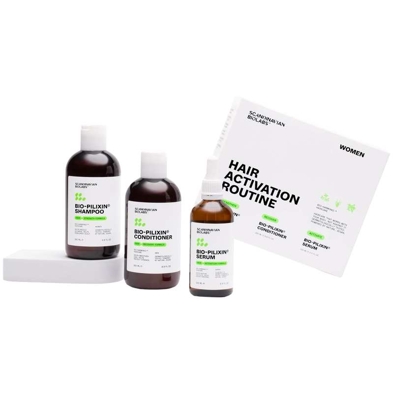 Scandinavian Biolabs Hair Routine Women er udviklet til at hjælpe med at reducere hårtab, supportere hårvækst, og hjælpe med at vedligeholde sundt og stærkt hår. Hvert produkt indeholder planteingredienser, hvoraf nogle er udviklet fra stamcelleteknologi, for at pleje hårsækkene og fremme hårvækst.